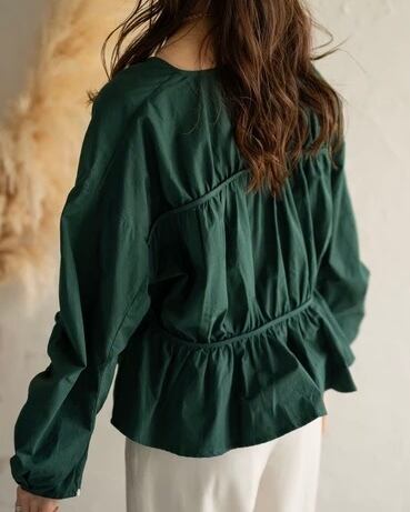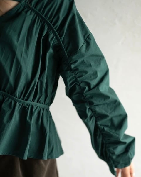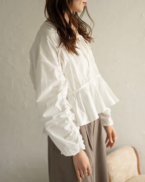 ■袖にたっぷりとギャザーをあしらい、優雅に揺れるフェミニンシルエットを実現