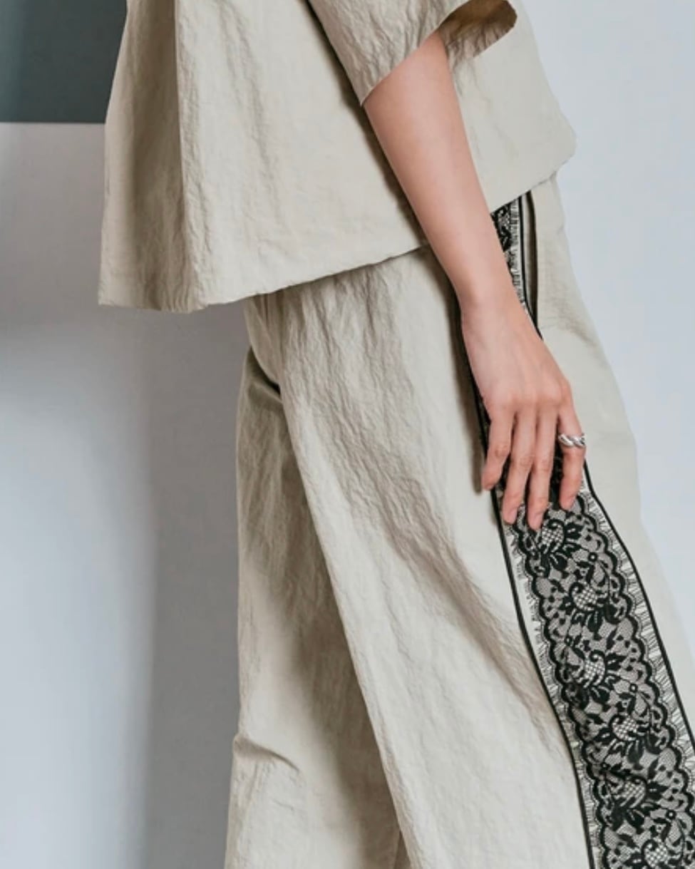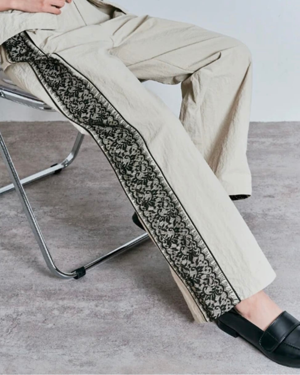 ■サイドに太めのレースラインを施した撥水素材のセミワイドパンツ。