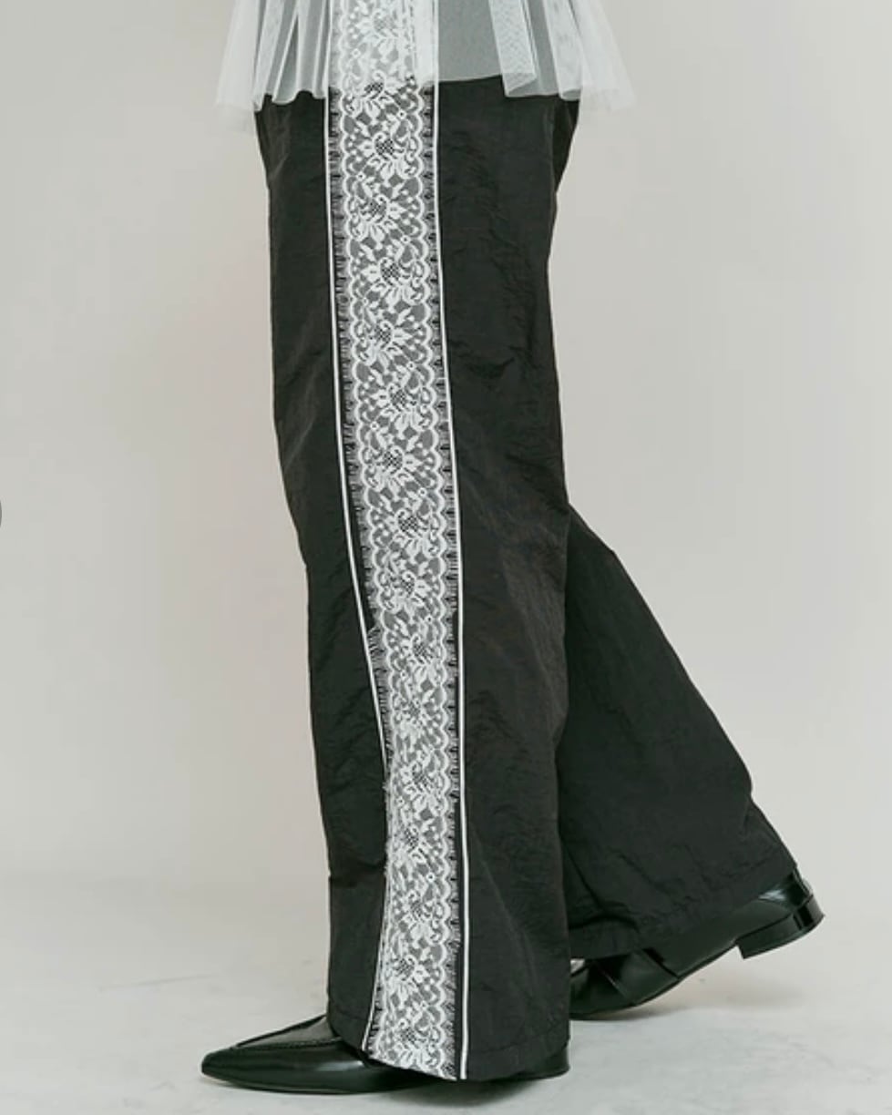 スポーティーになりがちなナイロンパンツにレースをプラスし、女性らしく着用できるボトムスです。