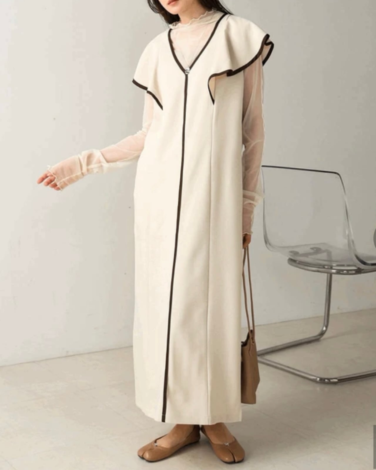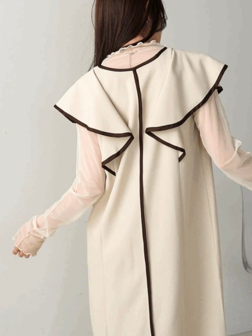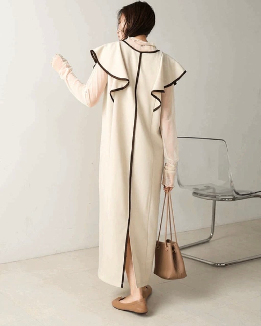 ■品のあるフリル袖と落ち感のある生地でストンとしたシルエットはパイピングと相まって縦ラインを強調し、シャープに見せてくれます。